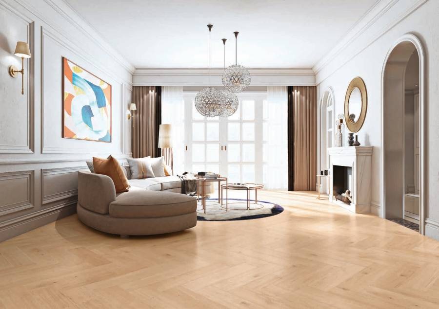 Manor to także technologia Fold-Down – deski są układane w systemie “na klik” – wystarczy połączyć je dłuższym bokiem pod kątem 20-30 stopni, a później docisnąć krótszy, by szybko i stabilnie ułożyć podłogę. Panele w jodełkę od Classen możesz także układać na kilka sposobów, wykorzystując załamanie światła dla osiągnięcia oczekiwanego efektu: wzdłużnie, co optycznie wydłuży pomieszczenie, poprzecznie, dodając mu optycznie wizualnie szerokości lub po przekątnej, tworząc efektowny kontrast. Panele posiadają także matową strukturę, dzięki czemu dodają ponadczasowej elegancji i naturalności każdej przestrzeni, w której zostaną zamontowane. Z Manor pożegnasz także, charakterystyczne dla tradycyjnych parkietów w jodełkę, skrzypienie podłogi.