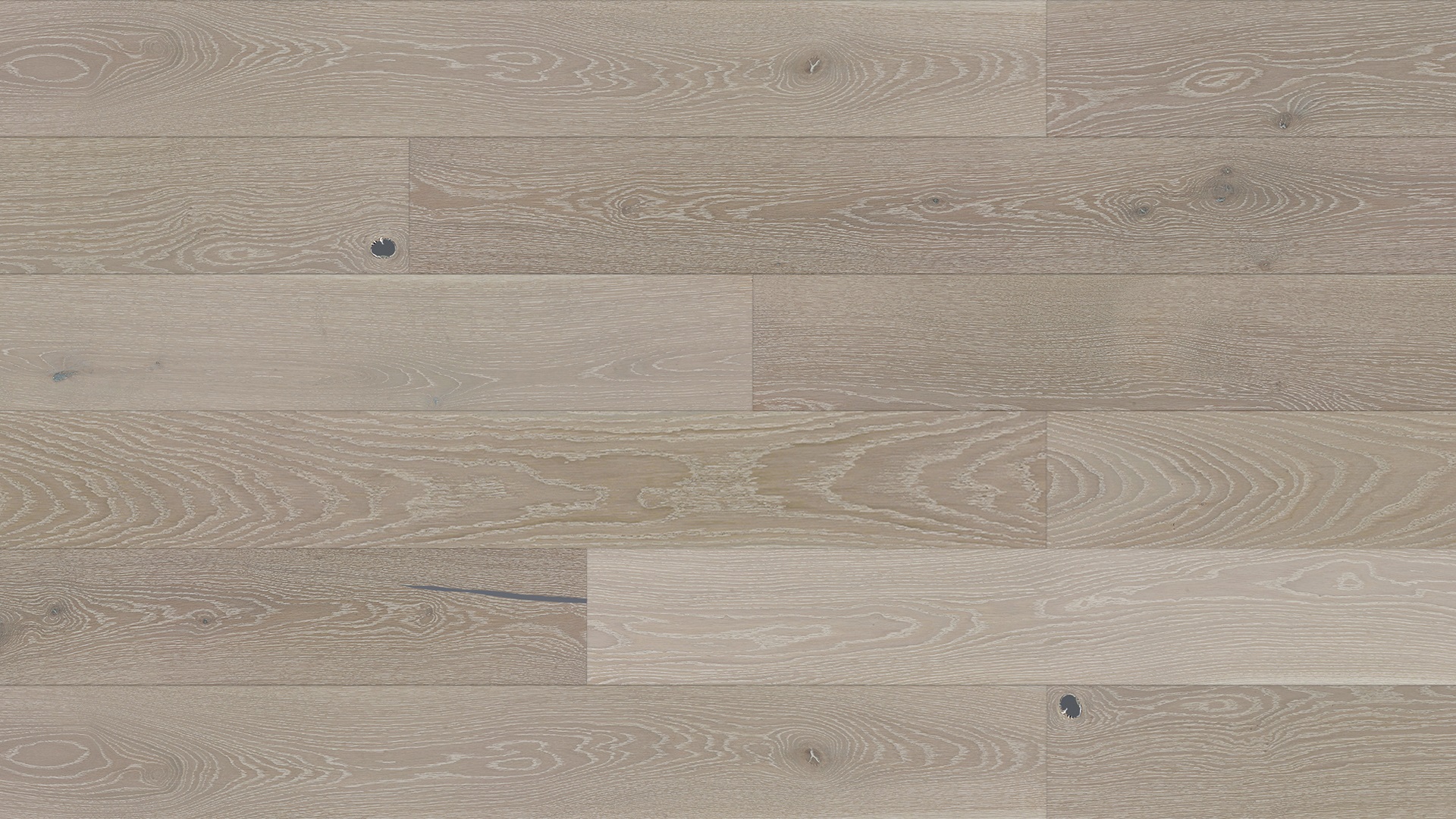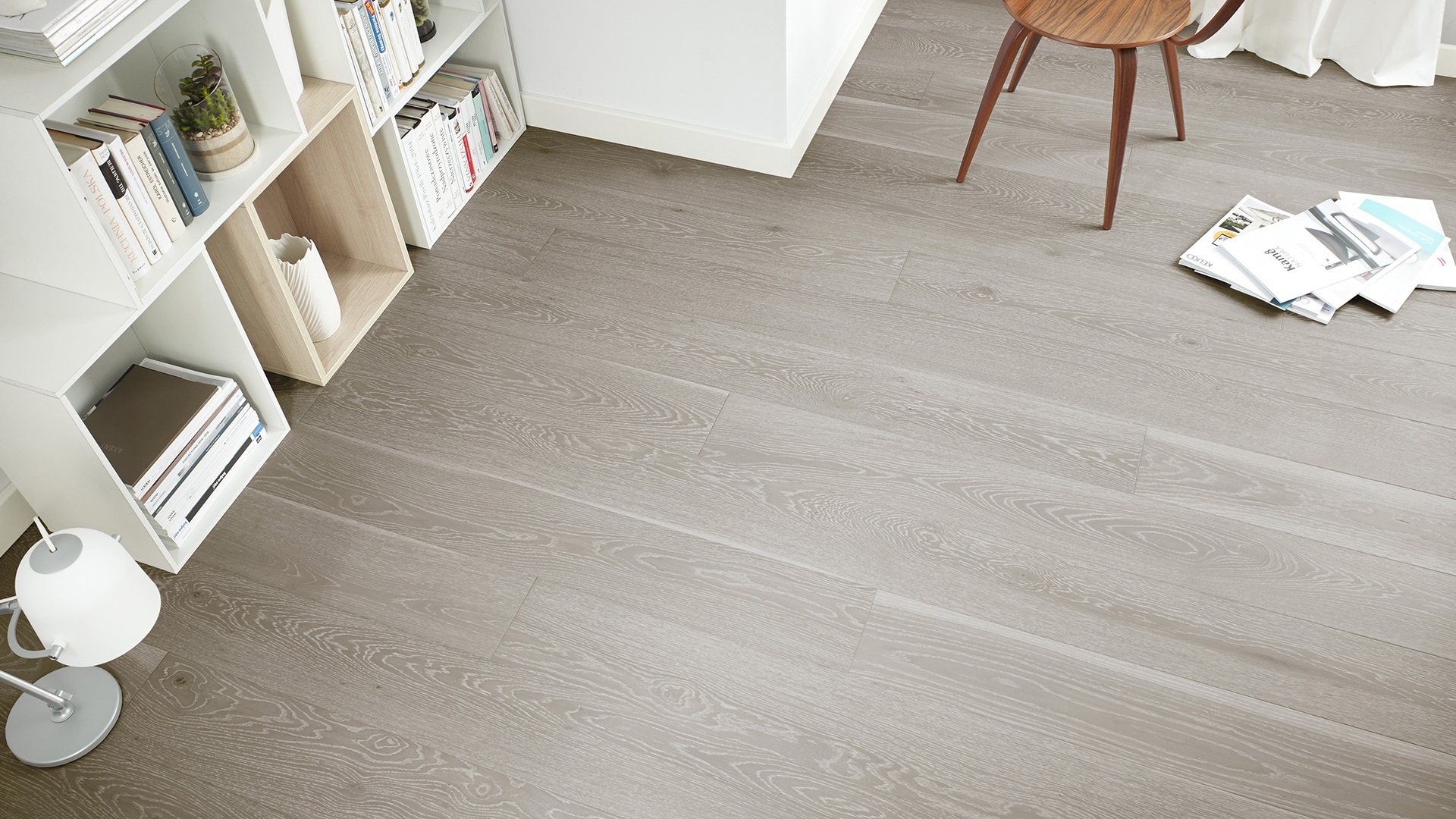 Podwójnie barwiona dębowa podłoga uszlachetniona białym szczotkowaniem i 4-stronną microfazą, wykończona lakierem matowym.