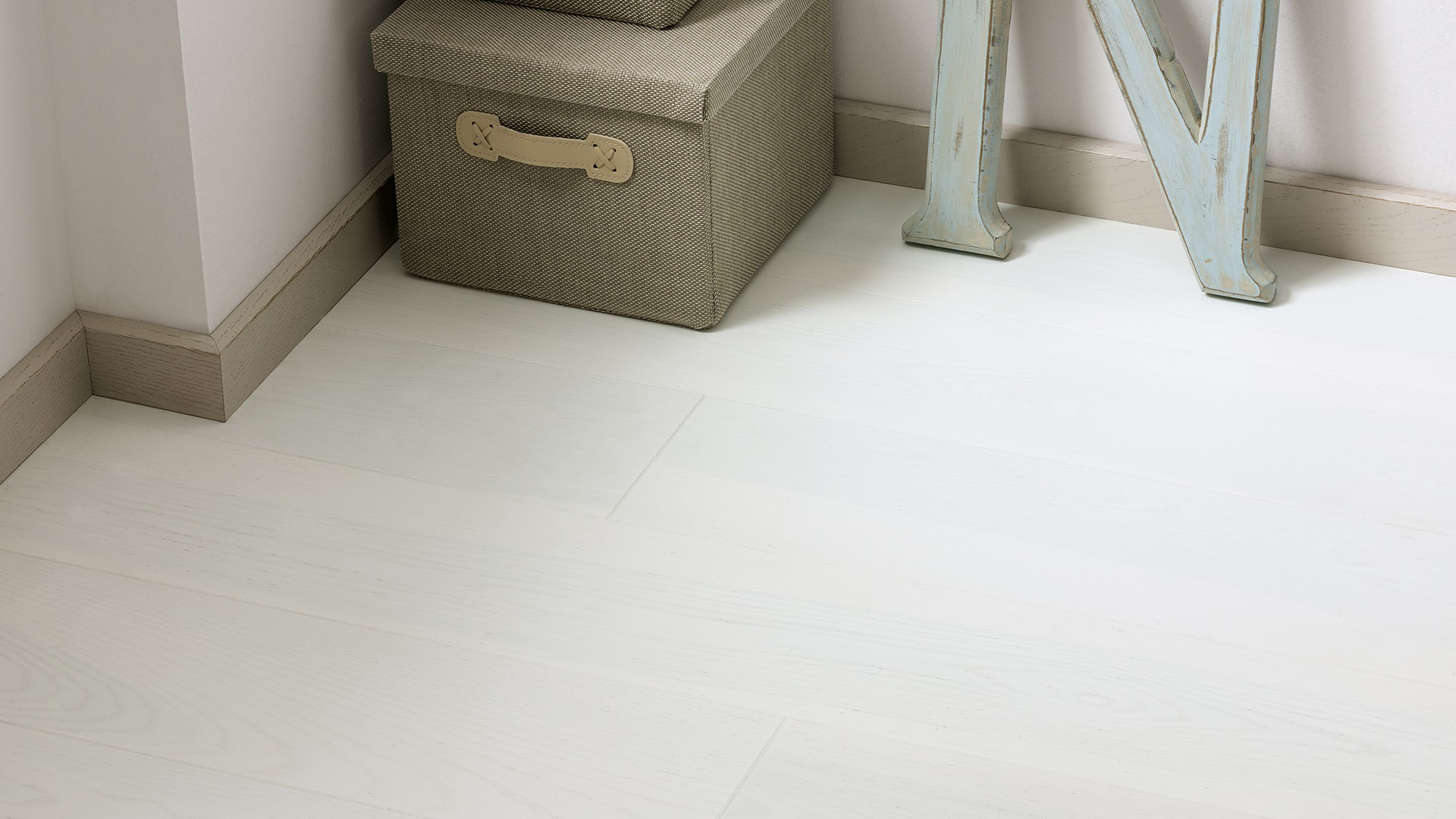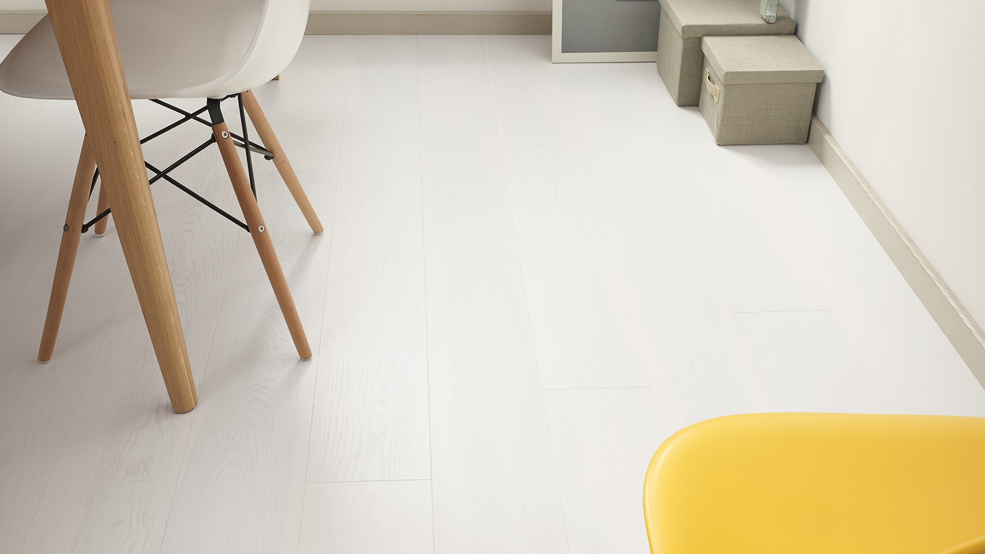 Podłoga 1-lamelowa, o mroźnym odcieniu cytrynowego sorbetu. Nowoczesna, odważna forma, pokryta białym, matowym lakierem. Krawędzie zaznaczono subtelną microfazą, co optycznie wydłuża kształty desek. Strukturę drewna podkreślono szczotkowaniem, a całość zdobi umiarkowany wachlarz naturalnych cech drewna.